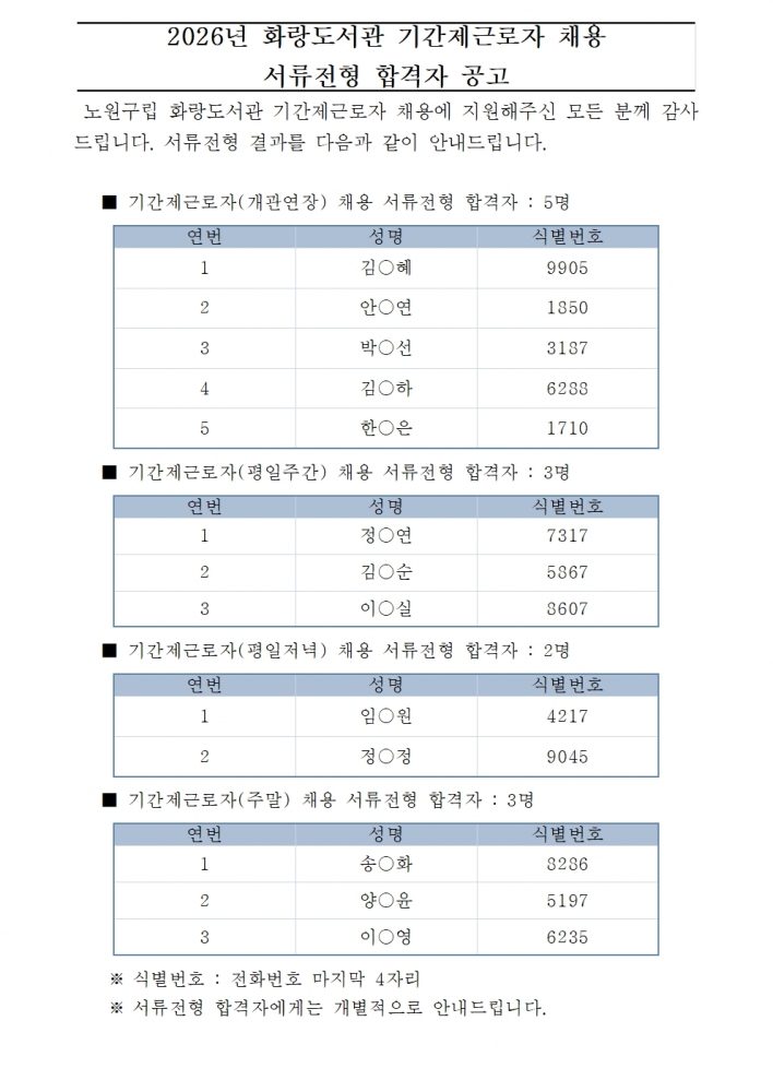 2026년 화랑도서관 기간제근로자 채용 서류전형 심사 합격자 공고