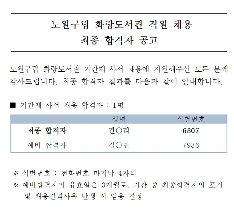 2026년 화랑도서관 직원 채용(계약직-사서) 최종합격자 공고