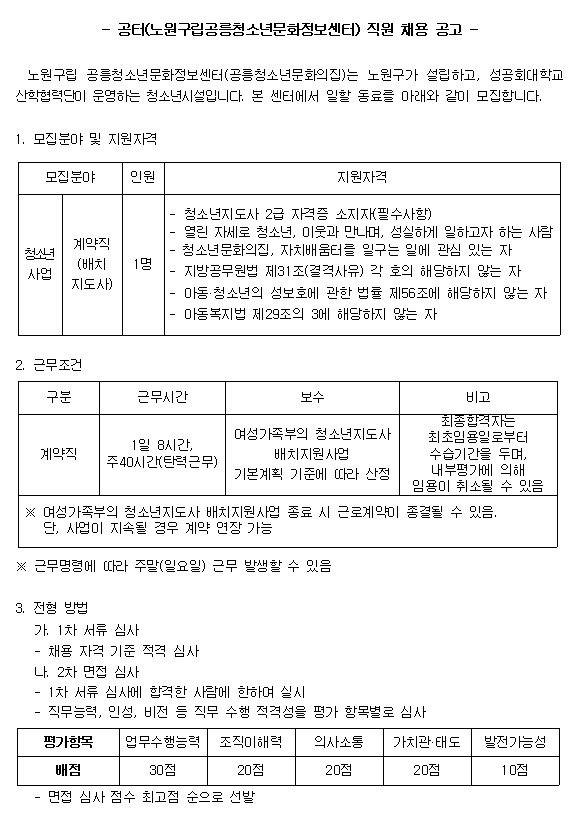 공릉청소년문화정보센터 직원 채용 재공고(청소년배치지도사)