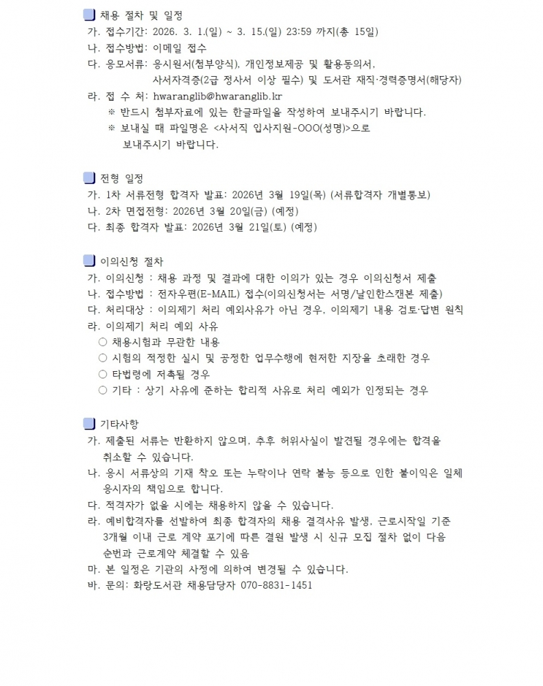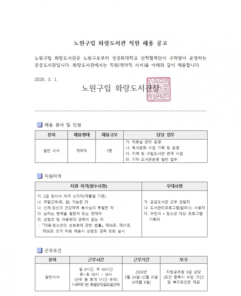 2026년 노원구립 화랑도서관 직원(계약직-사서) 채용 공고