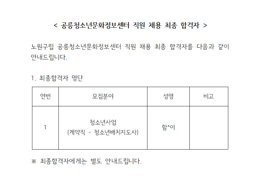 공릉청소년문화정보센터 직원 채용 최종 합격자 발표